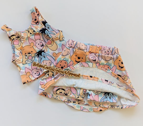 Sizing: Button up is true to size. The athletic skirt set runs very generous, it is recommended to size down for a more fitted look. The top is a shorter style but not meant to be cropped, however it may show some belly. Skirt includes attached shorts. Model is 41" tall and 36 pounds wearing size 3T.